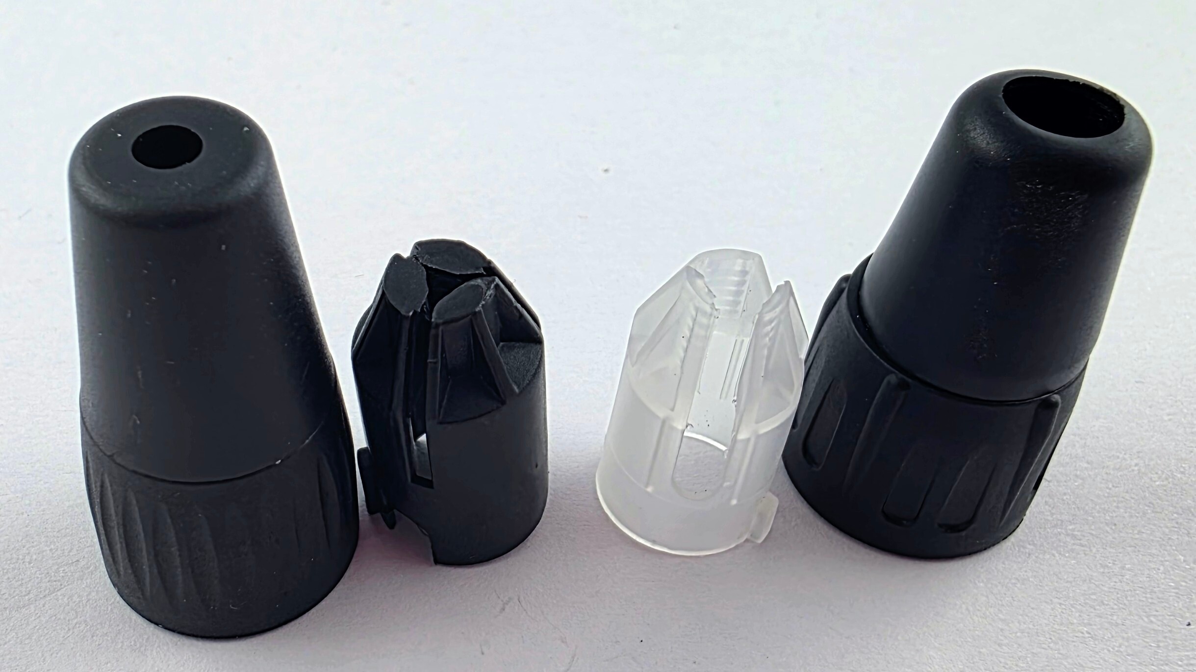 | GCXLR3FBS | Gold Plated XLR 3 Pin Female Connector. Small, Gold plated contacts Black surface. Full metal boddy fits cables up to 3 - 4.0mm Ø Picture shows cable entry and strain releife clamp |